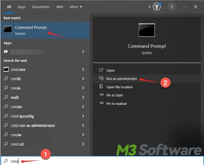 - Type “cmd” in the Windows search bar and select “Run as administrator.”