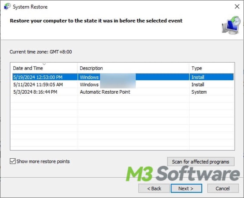 - Choose a restore point, the “Data and Time” before the data loss during cut and paste(you can click show more restore points to see more options).