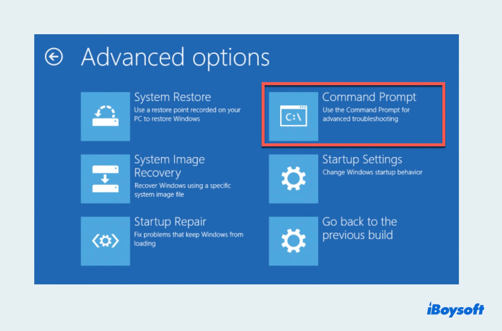 - Choose the language, then select "Repair your computer" > "Troubleshoot" > "Advanced Options" > "Command Prompt".