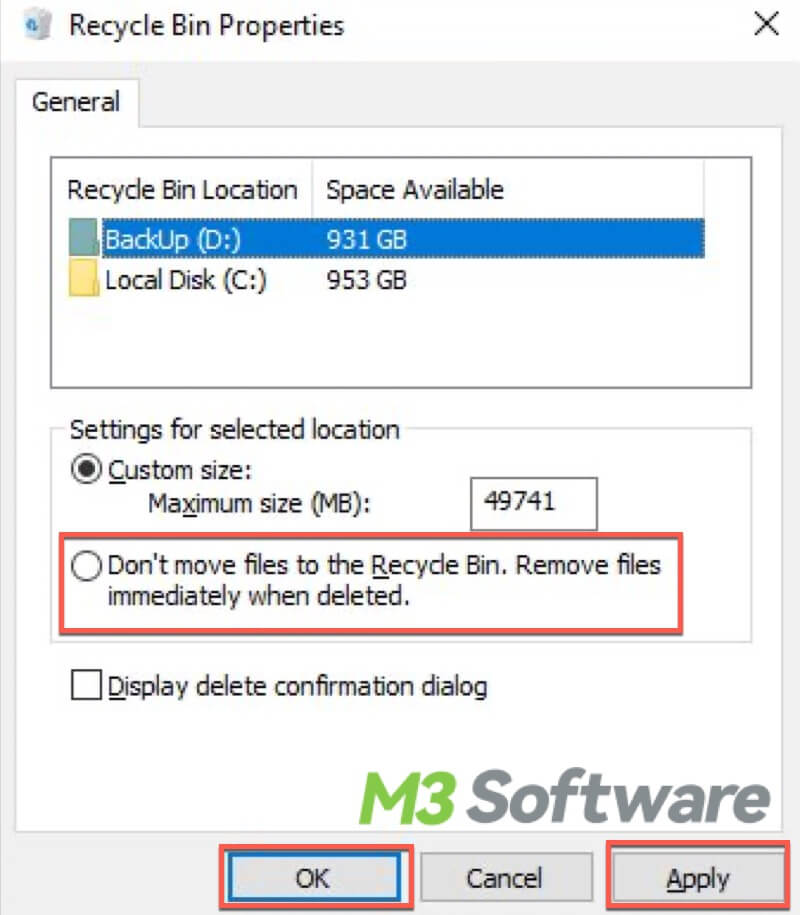 - Select the option "Don't move files to the Recycle Bin. Remove files immediately when deleted."