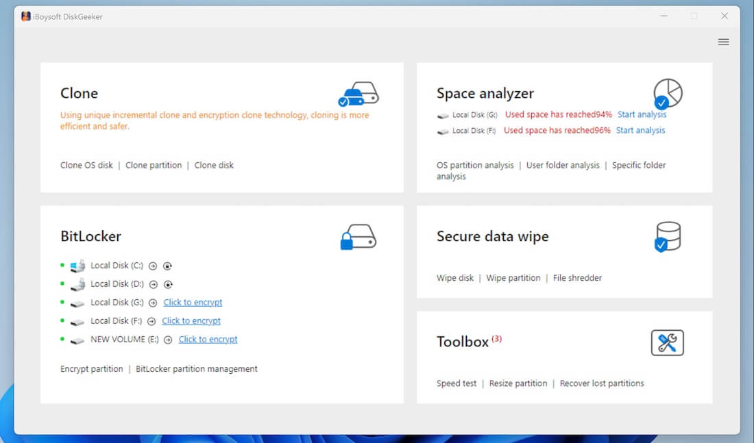 iBoysoft DiskGeeker for Windows is a professional disk management tool. The “Space analyzer” feature can easily analyze disk space, and you can quickly spot large files in partitions or folders, then you can remove those files to free up more space, effectively saving your time and effort.